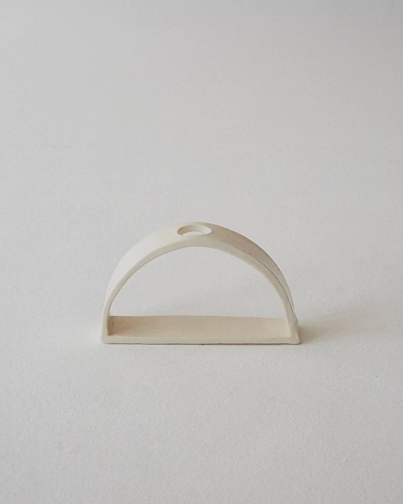 Castiçal decorativo em tom off white acetinado. Feito em cerâmica, pintado à mão e queimado em alta temperatura. Indicado para velas de diâmetros variados (o tamanho do furo varia entre 2-3 cm).