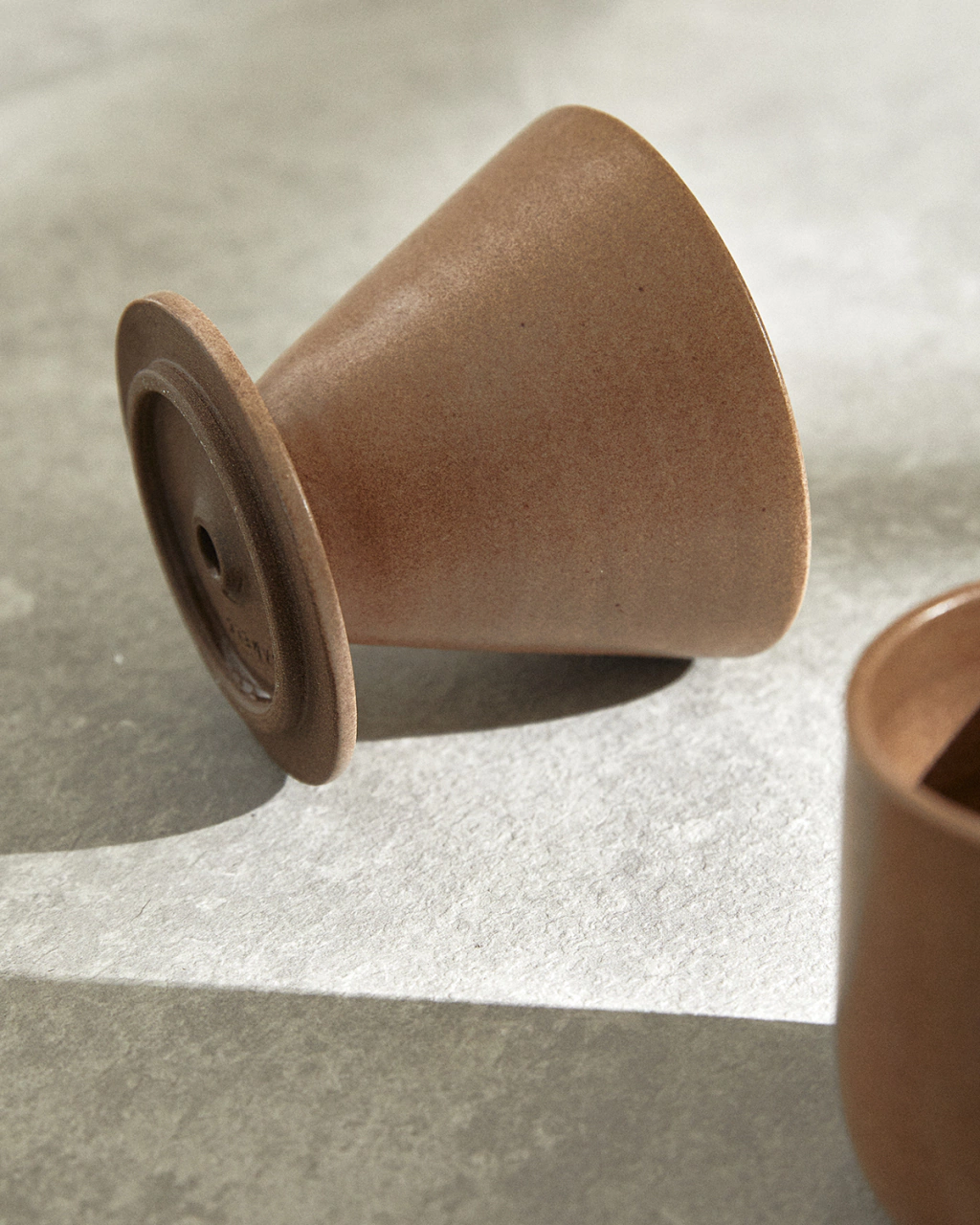 Suporte para coador de café de papel/tecido em tom marrom frio acetinado. Indicado para coador tipo melita tamanho 102. Feito em cerâmica, pintado à mão e queimado em alta temperatura. Encaixa em copos de diâmetro de 7 cm, compatível com nossos copos médio, alto e copo com pires. Para comprar o jogo de coador + copo, clique neste link.