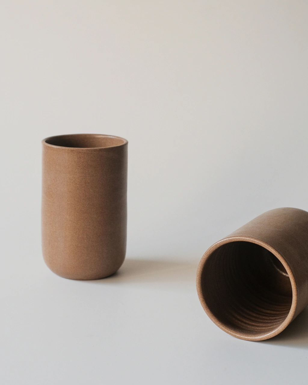 Copo grande em tom marrom frio acetinado. Feito em cerâmica, pintado à mão e queimado em alta temperatura.